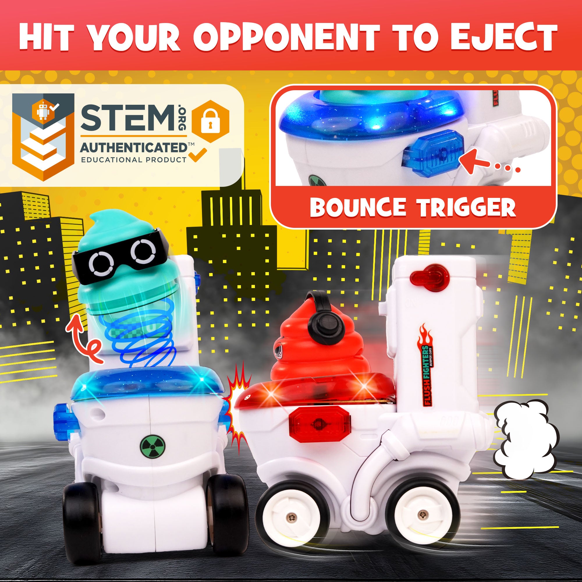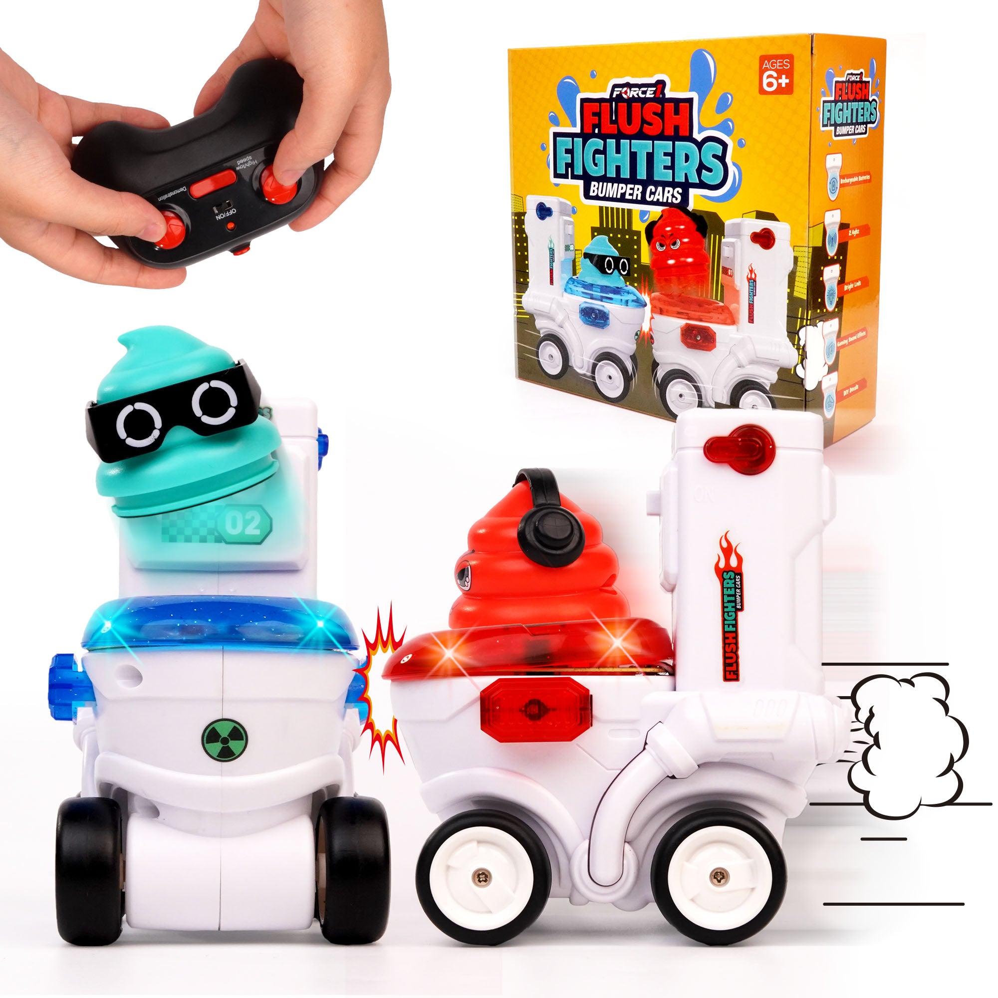 FLUSH FIGHTERS BUMPER CARS FOR KIDS: Race, crash, and watch figures eject with this 2-pack of hilarious toilet-themed mini rc cars with rechargeable batteries and 2 remote control transmitters for fast-paced bumper car battles!