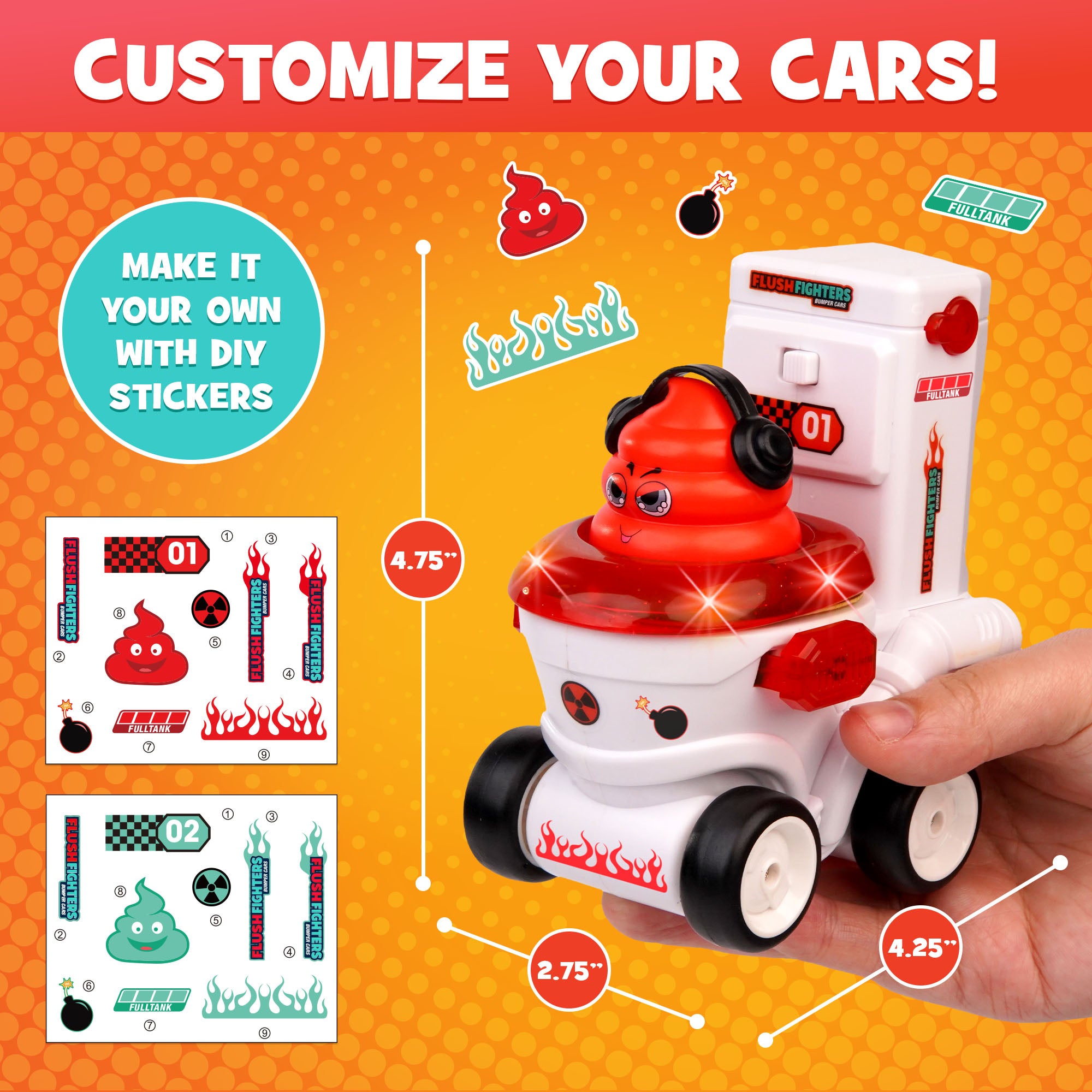 COMPLETE RC BUMPER CAR SET: Pack includes 2 x Flush Fighters remote controlled cars with detachable ejecting figures, 2 x 2.4GHz transmitters, 2 rechargeable batteries, 2 USB chargers, and DIY stickers. Each car measures 4.25" L x 2.75" W x 4.75" H for compact crash fun.