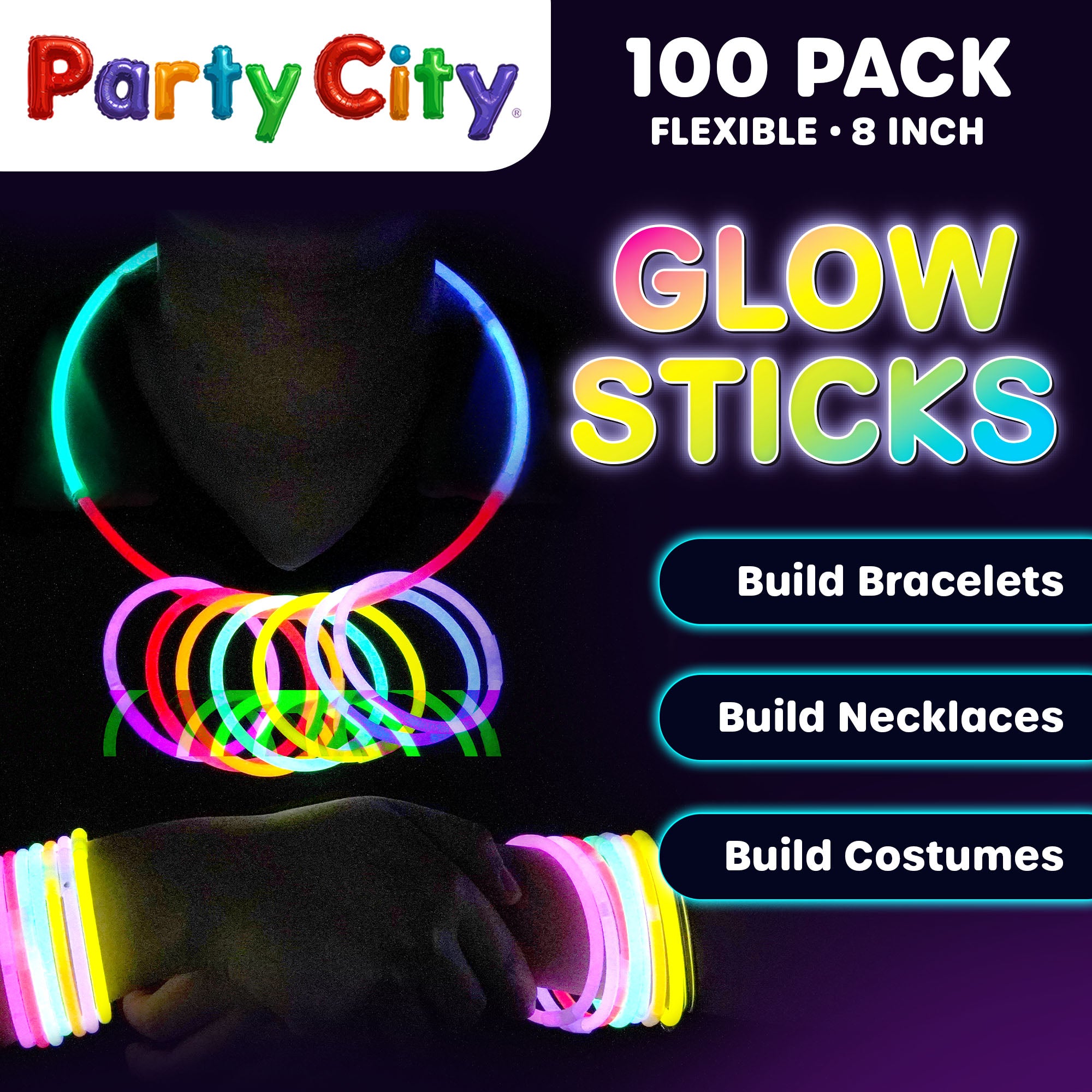 Authentic Party City Glow Sticks for Kids and Adults: Light up your event with this 100 party pack of 8” glowsticks, trusted by Party City—your go-to for party supplies and celebration fun. Includes connectors to create glow in the dark bracelets, necklaces, anklets, and crowns in vibrant neon colors