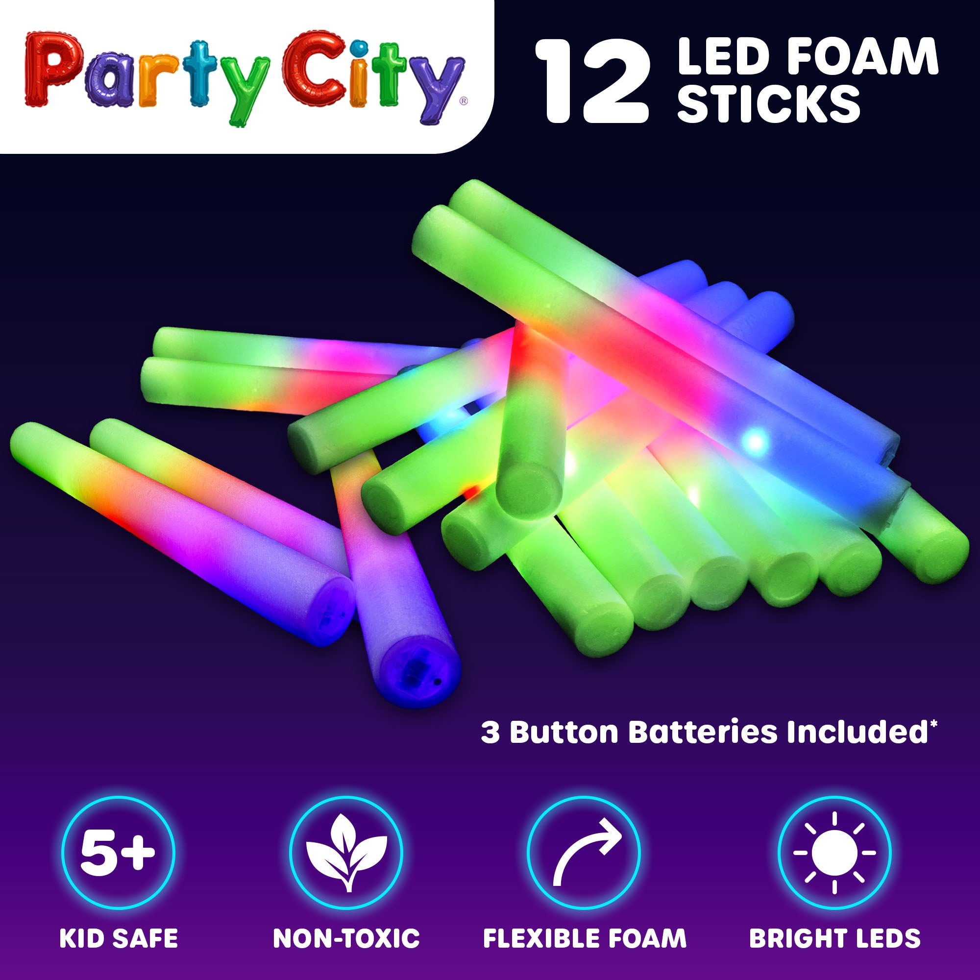 Authentic Party City LED Foam Glow Sticks: Light up the night with this foam stick bulk party pack featuring 12 premium 14” white sticks that flash bright red, blue, and green LED lights. Trusted by Party City—your go-to for party supplies, celebration decor, and fun for all ages.