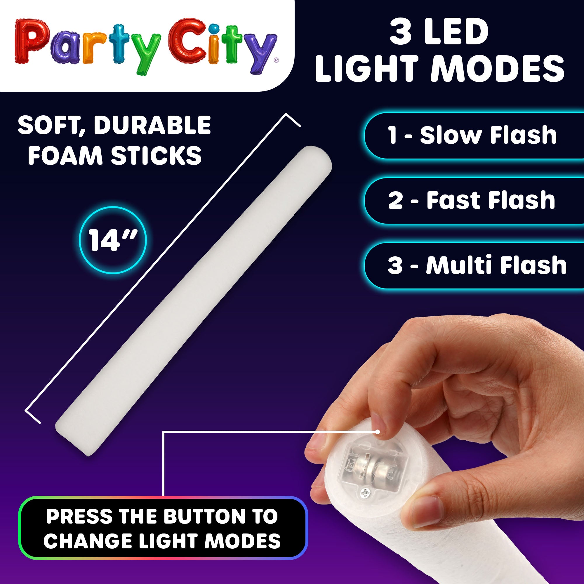 Authentic Party City LED Foam Glow Sticks: Light up the night with this foam stick bulk party pack featuring 24 premium 14” white sticks that flash bright red, blue, and green LED lights. Trusted by Party City—your go-to for party supplies, celebration decor, and fun for all ages.